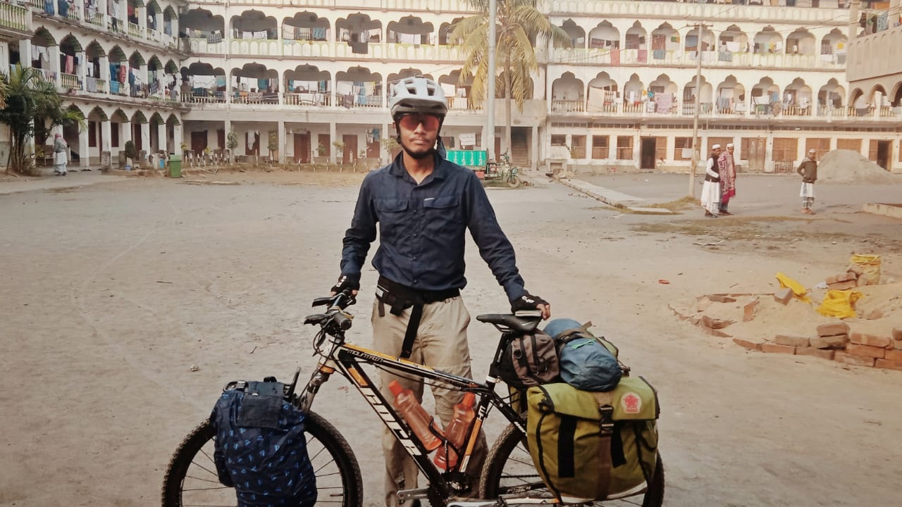 মন্দির ফেলে আরও প্রায় দুই কিলোমিটার সামনে পৌছে একটা ব্রিজ পড়লো, ছোট্ট কালভার্ট, পথ চলে গেছে তিনদিকে। ওখানে দাঁড়িয়ে ম্যাপ খুললাম, আর ঠিক তখনই, কানে মধুর বর্ষণের মত শোনালো সেদিনের মাগরীবের আজান। কি ভীষণ খুশী যে হলাম! আমি তখনই সাইকেলের মুখ সেদিকে ঘুরিয়ে দিলাম। কাছাকাছি গিয়ে দেখেছিলাম, ওটা একটা বিরাট বড় মাদ্রাসা। আমি মাদ্রাসার প্রাঙ্গণে হাফ প্যান্ট পরেই ঢুকে গেলাম যখন, ততক্ষণে মাগরীবের নামাজ শুরু হয়ে গেছে, আর, আমার খেয়াল এলো, আমি এখানে এই কাপড়ে থাকতে পারিনা আর এক মুহুর্ত ও।